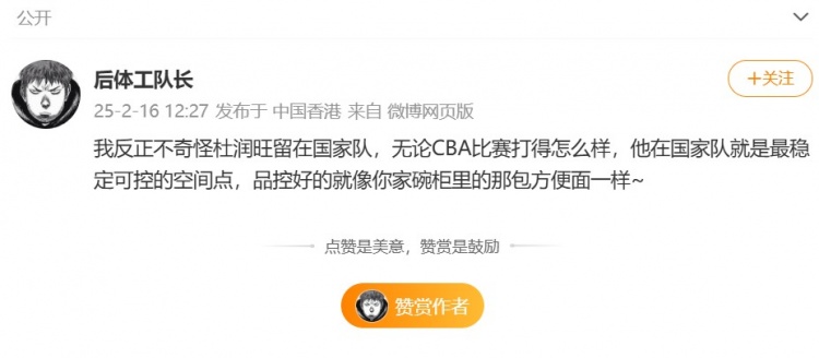 媒體人@后體工隊(duì)長發(fā)微博對(duì)此發(fā)表看法,他寫道:“我反正不奇怪杜潤旺留在國家隊(duì),無論CBA比賽打得怎么樣,他在國家隊(duì)就是最穩(wěn)定可控的空間點(diǎn),品控好的就像你家碗柜里的那包方便面一樣~??”
