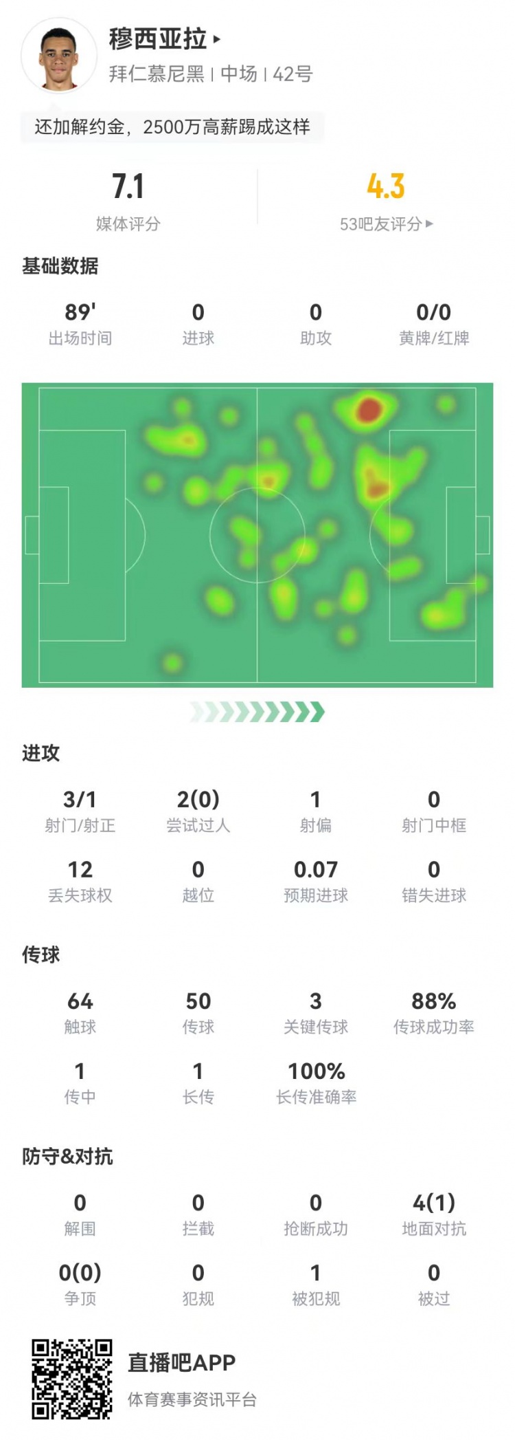 2月19日訊 拜仁在本輪歐冠1-1絕平凱爾特人,穆西亞拉本場數(shù)據(jù)如下: