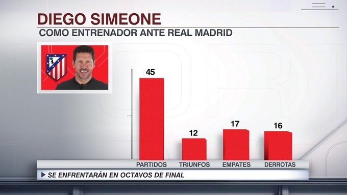 ESPN統(tǒng)計了西蒙尼作為馬競主帥對陣皇馬的數(shù)據(jù),統(tǒng)計表明,西蒙尼至今一共45次帶馬競與皇馬比賽,戰(zhàn)績12勝17平16負。