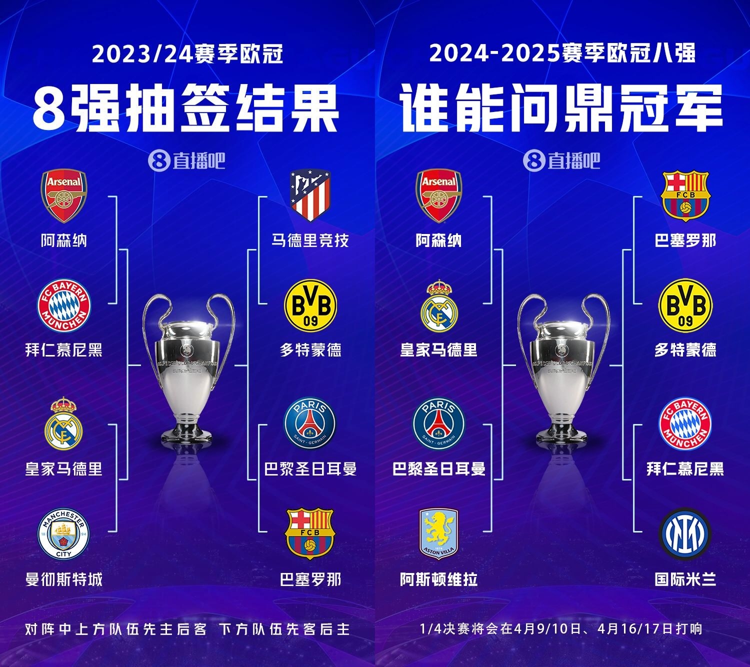 23/24賽季歐冠8強(qiáng):阿森納vs拜仁,皇馬vs曼城,馬競vs多特,巴黎vs巴薩