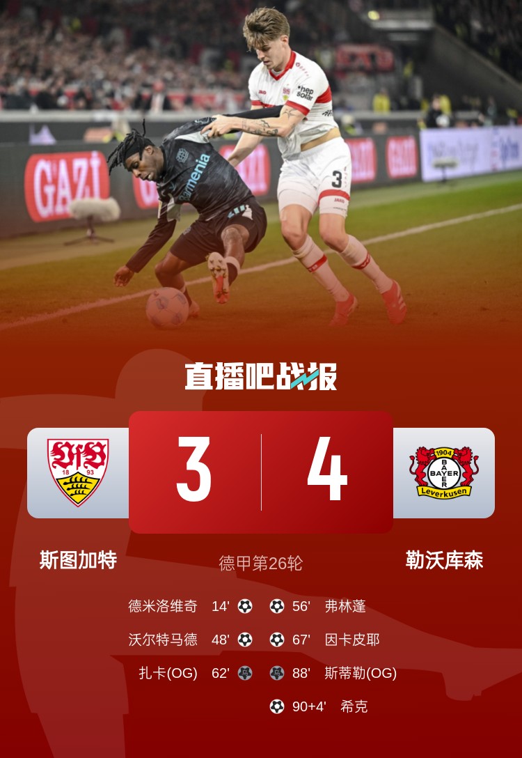 ??搜a(bǔ)時頭球絕殺,勒沃庫森4-3逆轉(zhuǎn)斯圖加特。積分榜方面,勒沃庫森落后拜仁6分。