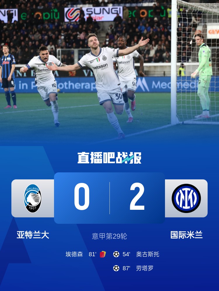 奧古斯托、勞塔羅破門,巴斯托尼、埃德森均兩黃一紅被罰下。最終國米2-0擊敗亞特蘭大。