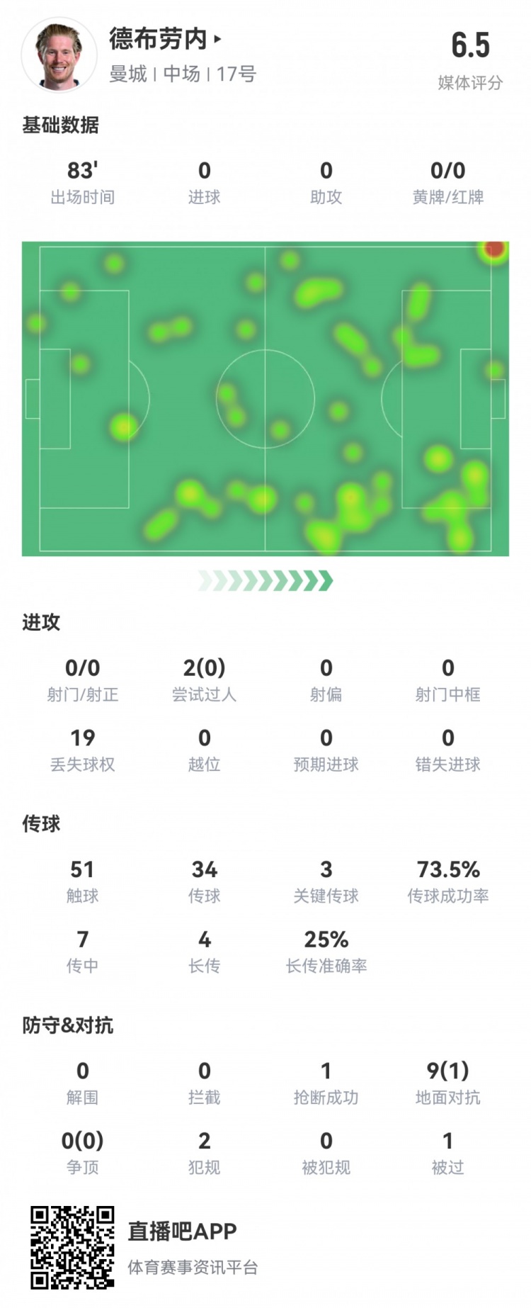 2月12日訊 歐冠淘汰賽附加賽首回合,曼城主場暫2-2皇馬。此役德布勞內(nèi)首發(fā)出場83分鐘被換下,球員全場重點(diǎn)數(shù)據(jù)如下↓