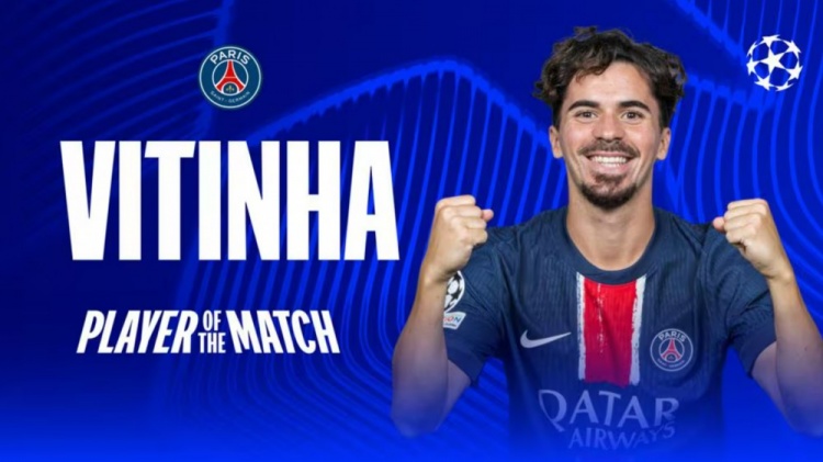 2月12日訊 歐冠淘汰賽階段的附加賽首回合,巴黎3-0完勝布雷斯特。賽后,維蒂尼亞當(dāng)選全場(chǎng)最佳球員。