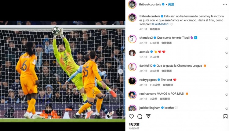 庫爾圖瓦曬出自己進行撲救的比賽照,并配文:“比賽還沒有結束,但考慮到我們的場上表現(xiàn),今天的勝利當之無愧。一如既往,戰(zhàn)斗到最后一刻!馬德里前進????”